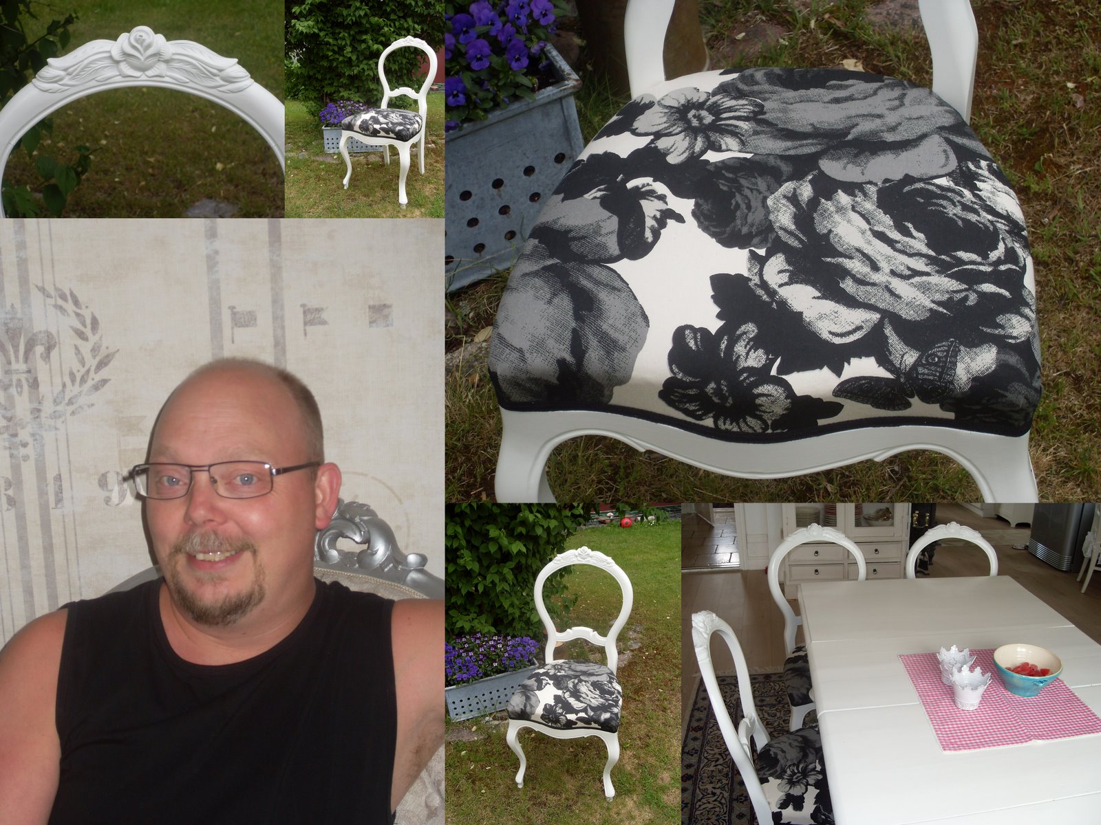 Så dök han upp då, mannen, myten, legenden, han som ser till att mina möbler är så snyggt omklädda. På mindre än en vecka har han klätt om mina 6 rokokostolar i fint Baronessa-tyg! Visst är han duktig?! Soffan han sitter i, min lilla rokokosoffa, har han klätt om den också. Nån som undrar vad han heter? Hos oss går han under namnet Palle, mannen som fixar allt.